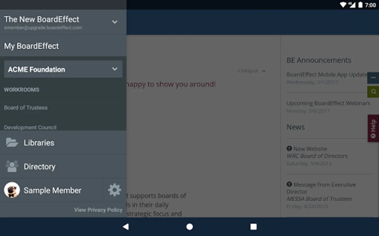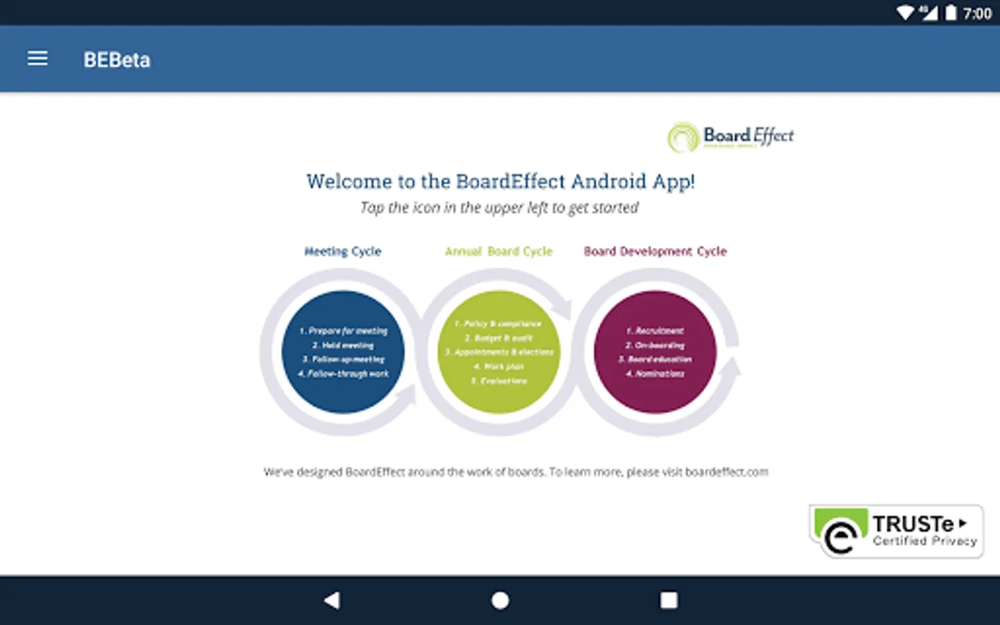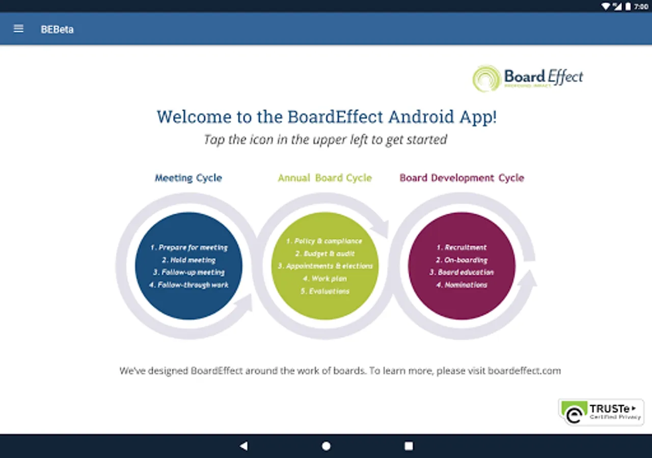 The BoardEffect Android App is free and works in conjunction with your secure BoardEffect web-based platform. For more information about BoardEffect, contact us at 1-800-961-6429 or www.boardeffect.com.