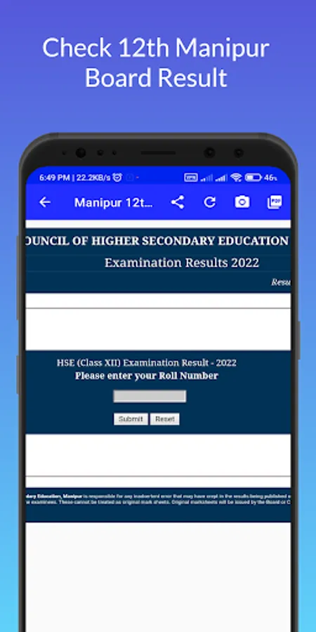 Disclaimer Note: This Application is not a official app of Manipur Board result. This app contains only the Web View system, in which we display the Website into app. So, If any error you face, regarding Manipur Board Results Please contact to your respective ones or website Owner.