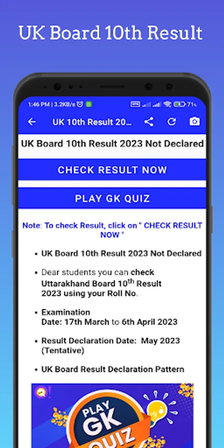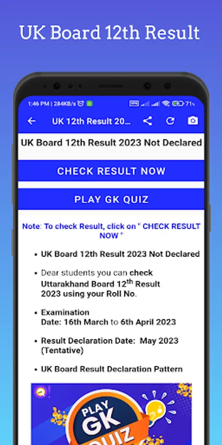 This App can send Push Notification You To When Result has been declared it can Show instant Board Result Update also Check UK Board Result News. it is good for those who have not experience for using internet who see fastest board result through out this app you can UK board time table 2023 12th & uk board time table 2023 10th When They Are Release you can check these thing it good for check 10th High School Board Result 2023.