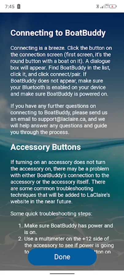 BoatBuddy app is an app to connect to the BoatBuddy BMU (Boat Management Unit) via Bluetooth, this app along with the BoatBuddy BMU, can control features on a boat, such as lights and pumps. It also can receive data from the boat such as battery levels, fuel levels.