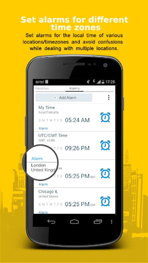 It also has an alarm facility that lets you set alarms for the local time of any location/time zone in the world.