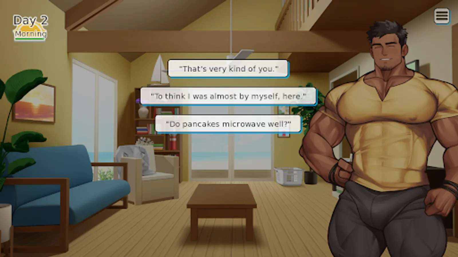 Have a chance encounter at a beach house with a friendly, muscular gay man by the name of Kyle. After a mix-up with your beach rental, you two find yourself becoming roommates on your short stay in paradise. He's not bad company by any means, but he does seem a bit melancholy... How will you spend your week-long vacation?
