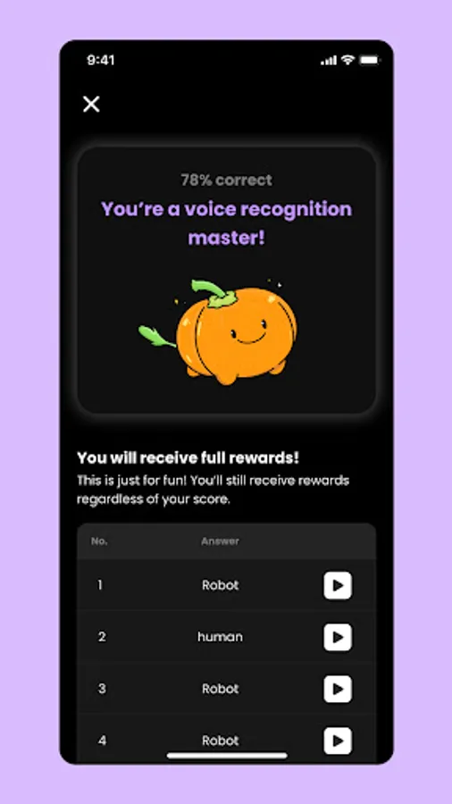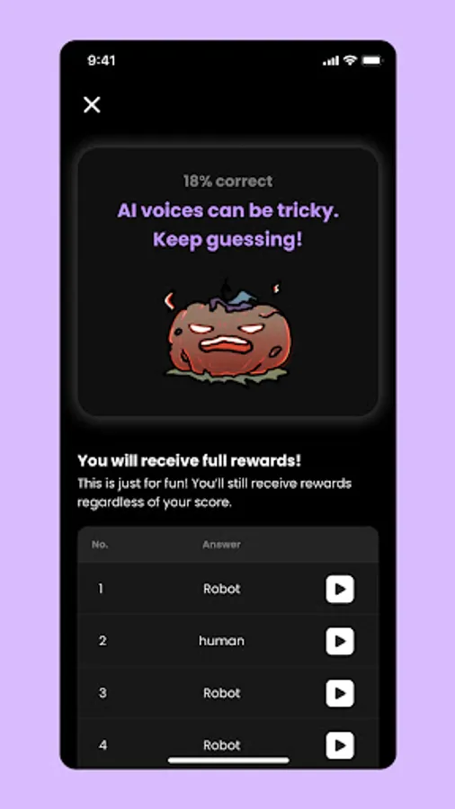 Experience the thrill of guessing AI and human voices and earn exciting rewards! Simply listen to the voices, distinguish between AI and human, and watch your rewards grow!