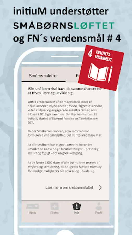 By using the initiuM app and the expert experts' advice, you create good conditions to give your child a safe start to life. With inspiration to ensure good well-being, development and learning, you are dressed to create the best conditions for your child.