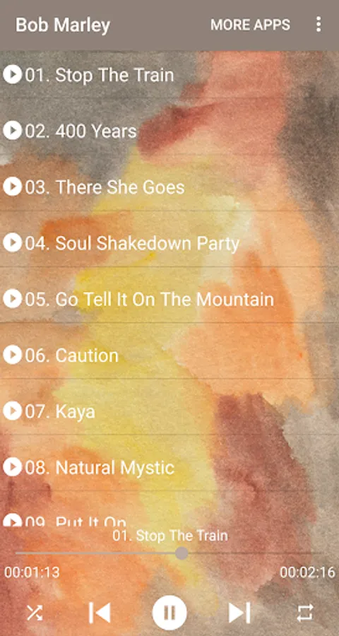 - Stop The Train - 400 Years - There She Goes - Soul Shakedown Party - Go Tell It On The Mountain - Caution - Kaya - Natural Mystic - Put It On - Rainbow Country - How Many Times - Keep On Moving - Small Ax - Corner Stone - Lively Up Yourself- Soon Come- African Herbsman- Mr. Brown - Memphis - You Can't Do That To Me - Riding High - Stand Alone - Sun Is Shining - My Cup - Trench Town Rock - All In One - Mellow Moods - Treat You Right - No Sympathy - Touch Me - Reaction - No Water– Can't You See– Try Me– Cheer Up– Brain Washing– Soul Rebel– Don’ T Rock My Boat– Fussin’ & Fighting’– Soul Almighty– Back Out– Hammer– It’s Alright– Duppy Conqueror– Soul Captives– Rebel's Hop– Do It Twice– Chance Are