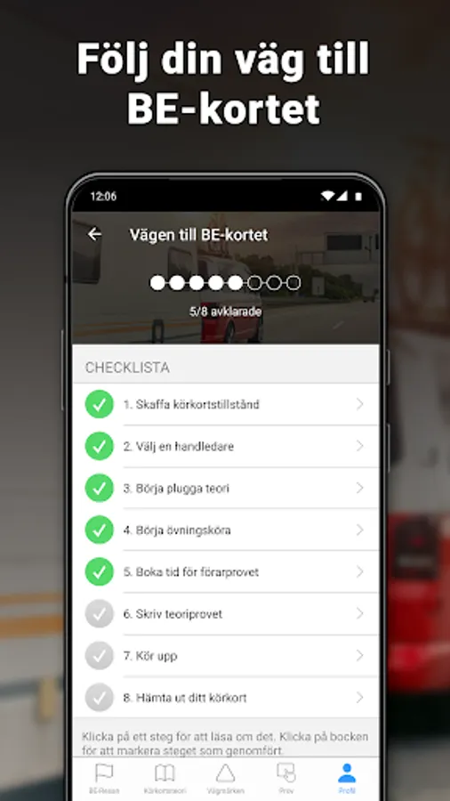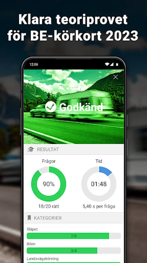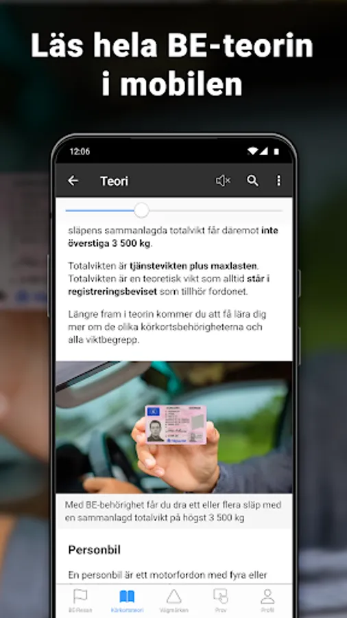 Download iKörkort BE Lite and read both BE and basic theory for free! Our driver's license theory is easy to read with lots of pictures and examples and contains all the information you need to learn to pass the theory test for a car with a heavy trailer and get a BE driver's license.