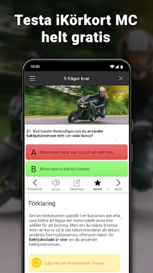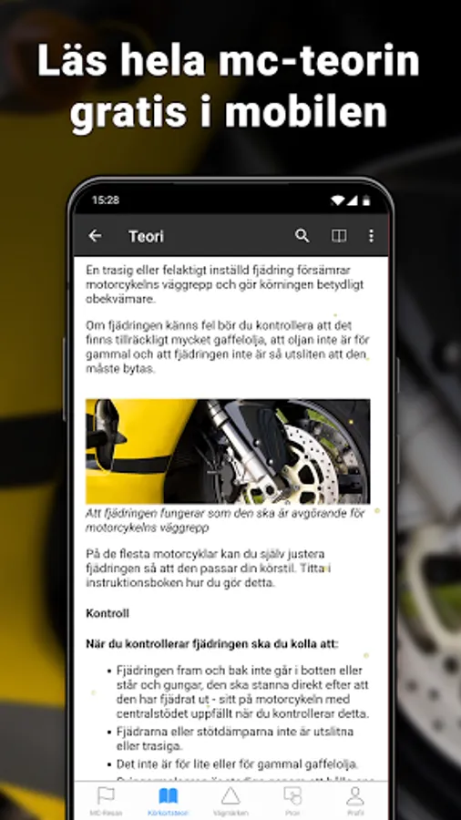 Download iKörkort MC Lite and read the entire MC theory and basic theory for free! Our driver's license theory is easy to read with lots of pictures and examples and contains all the information you need to learn to pass the motorcycle theory test.