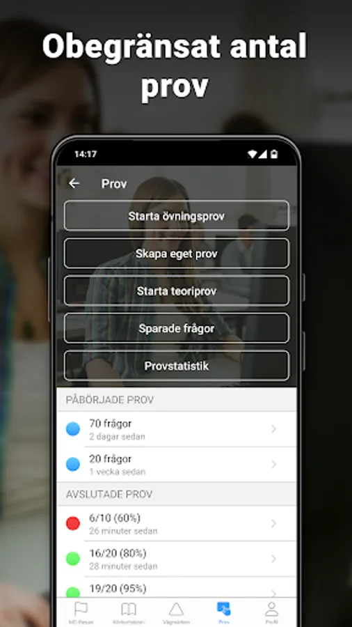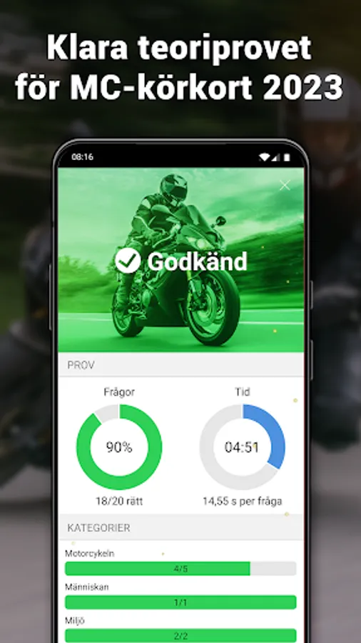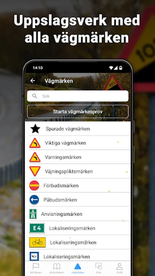 The app also contains a searchable and easy-to-read driver's license book that summarizes both MC theory and basic theory and tests your knowledge after each chapter, a checklist that guides you through all the steps until your MC license, a searchable encyclopedia with all of Sweden's road signs and detailed test statistics which shows your progress in 65 different subjects!