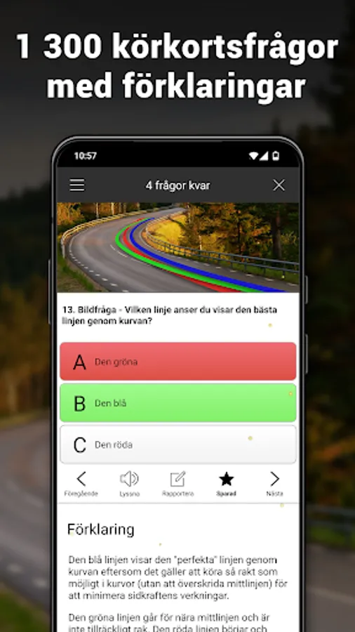 iKörkort MC also contains four different types of tests: smart practice tests, realistic theory tests, road sign tests and custom tests where you choose all the settings yourself. In our question database there are over 1,300 driver's license questions for MC that are very similar to the questions on the real test. In order for all new knowledge to sink in, all questions have clear explanations that quickly help you understand even the most difficult questions.