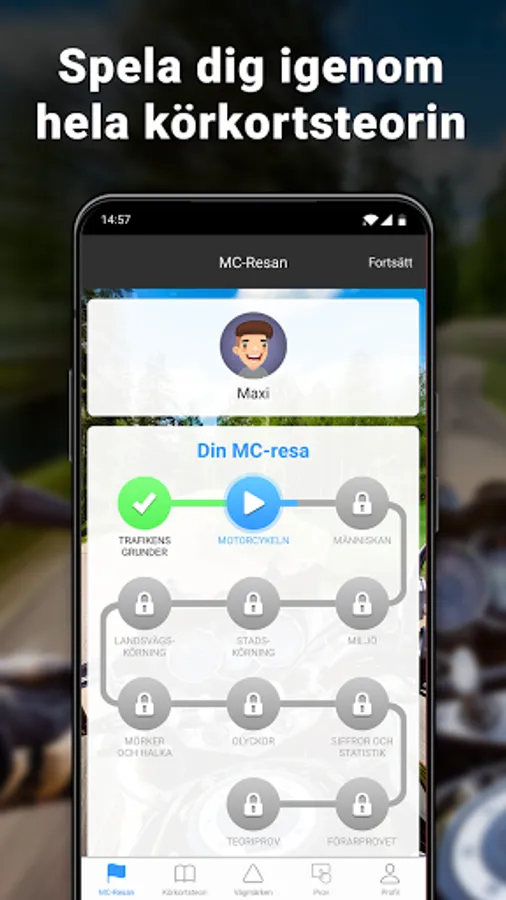 With iKörkort MC, you can play your way through the entire theory training with the educational game MC-Resan. The game consists of short theory lessons, road sign levels and different types of tests. During the game you collect stars and unlock medals. Once you've passed the game, you'll have all the knowledge you need to pass the real theory test!