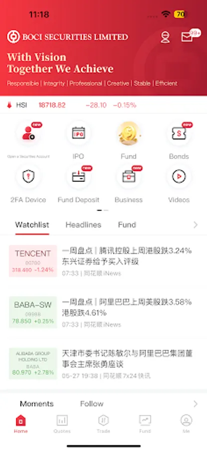 BOCI APP is a comprehensive mobile app that integrates Hong Kong and US stocck quotes, hot news, securities trading, account opening application and social function for customers of BOCI Securities Limited.