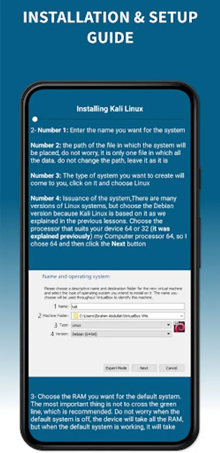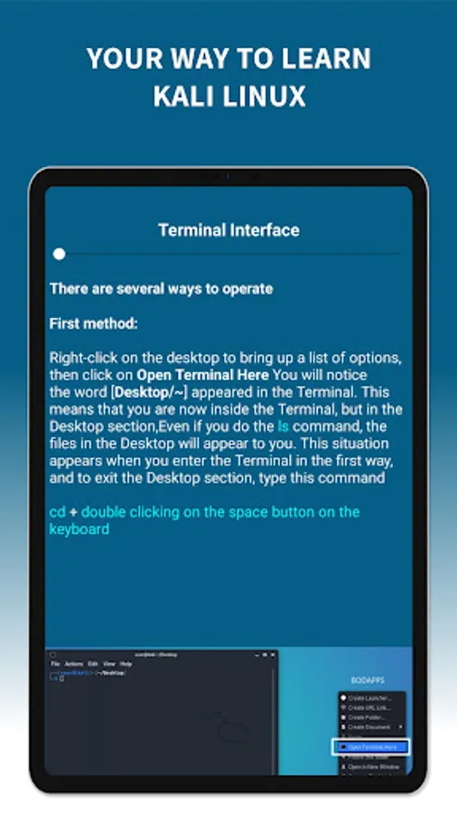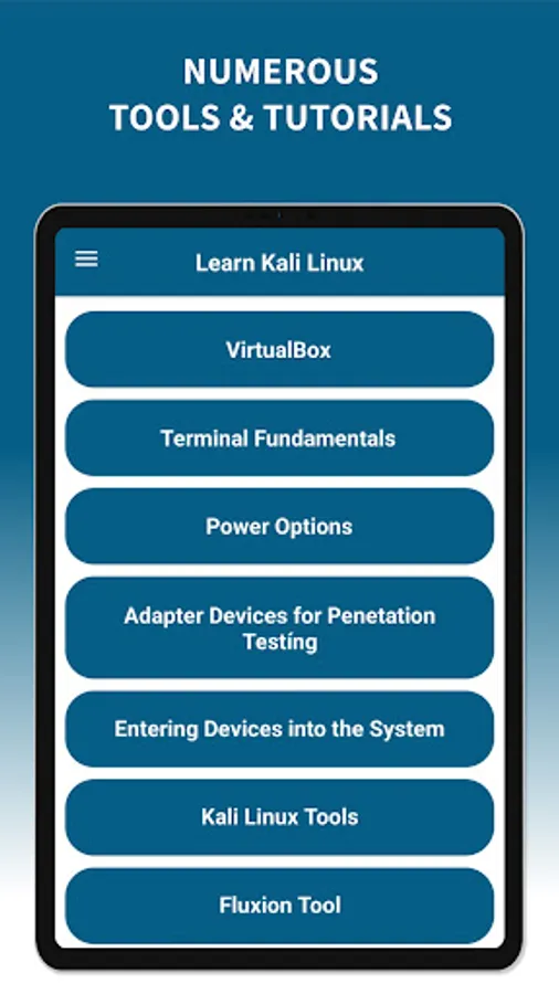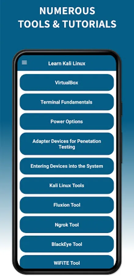 Kali Linux Tutorials app will help you learn how to install Kali Linux and the basics of the terminal. The app also contains an explanation of the important sections of tools and information in the field of cybersecurity.