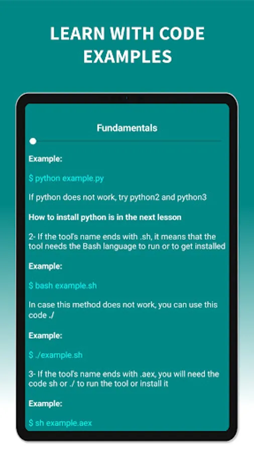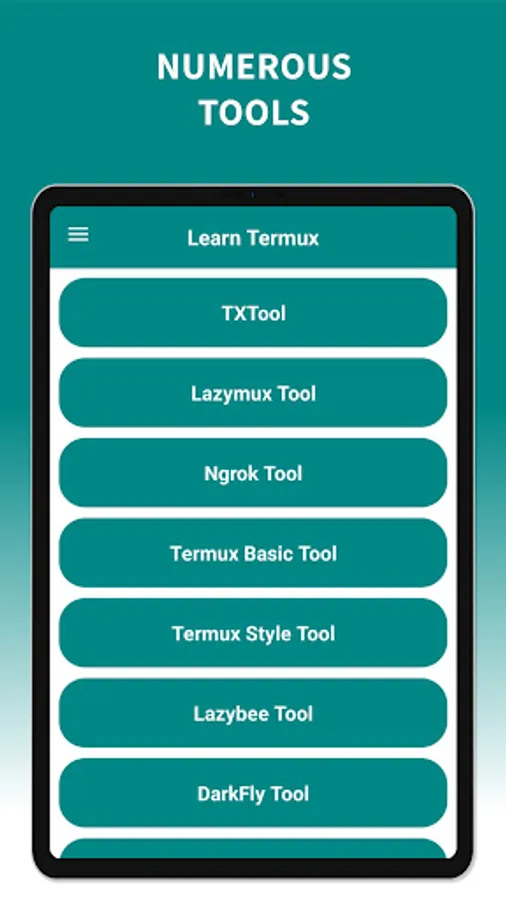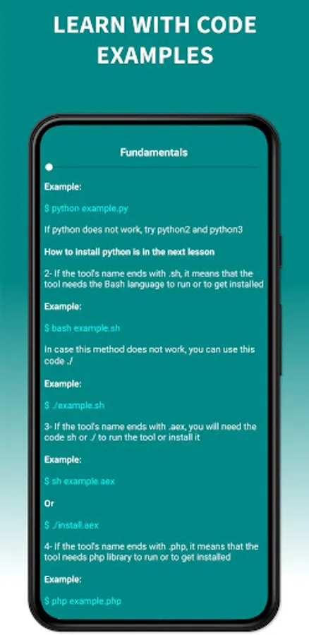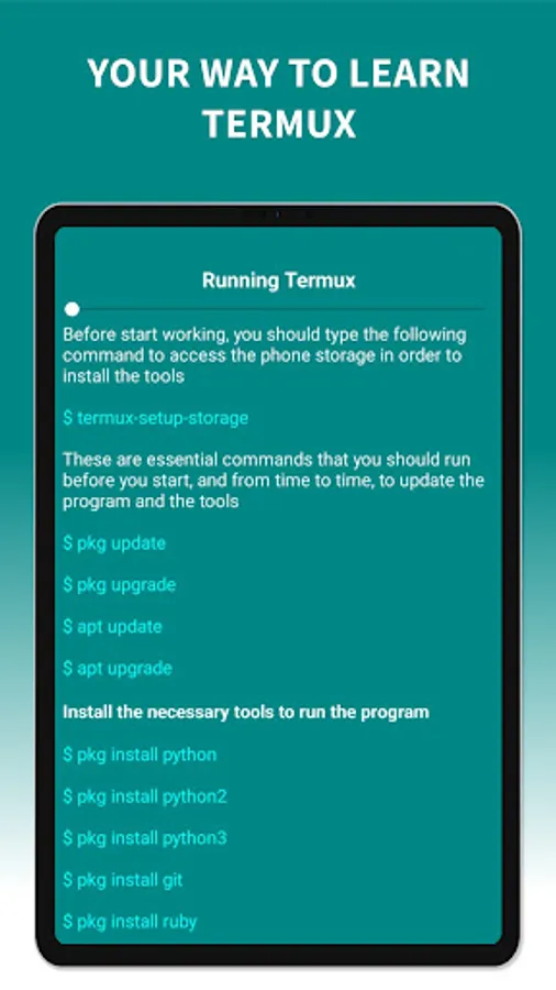 Learn Termux tutorials are designed to help you learn Termux, from setting up the program and typing commands to using many of its tools. The app explains the functions of the tools and how they can be installed and used, in addition to many code examples to help you on your learning journey.