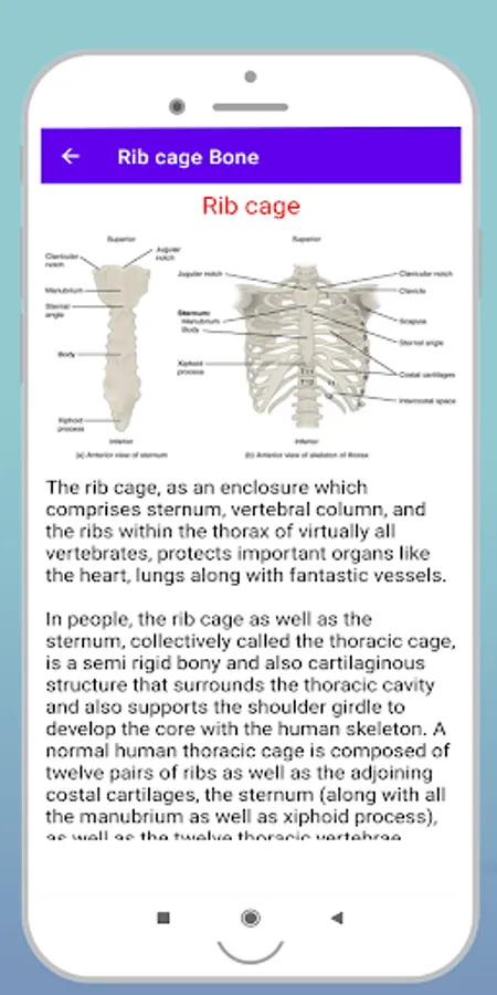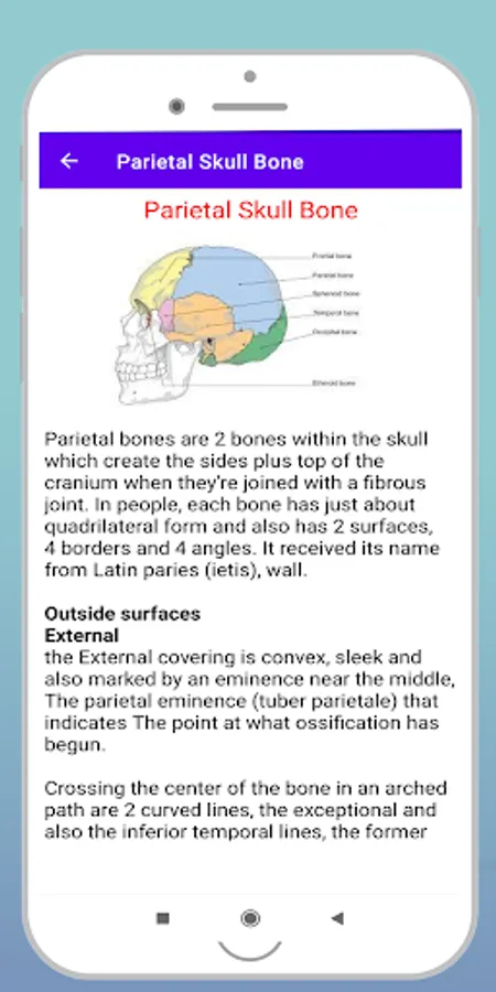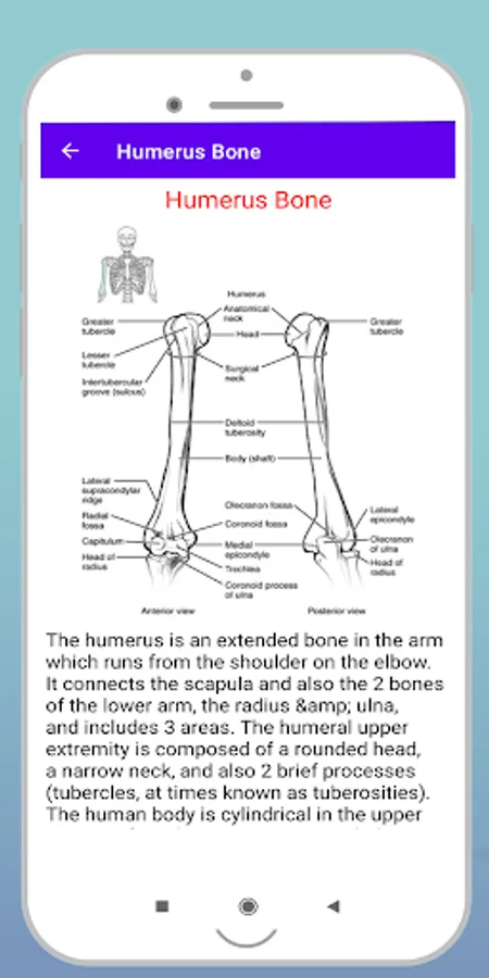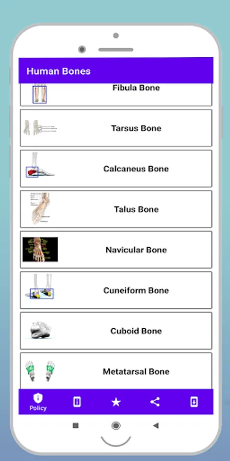Human Bones Name and picture with information You can know and learn from this app. This is an educational application Guide. List of Bones in Human Body and Types of Skeleton. Learn of Skeleton Anatomy.