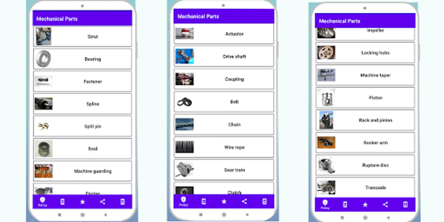 Mechanical Parts Name and description with picture from this app. List of Basic Mechanical Parts and Mechanical engineering elements. Mechanical hand tools guide.