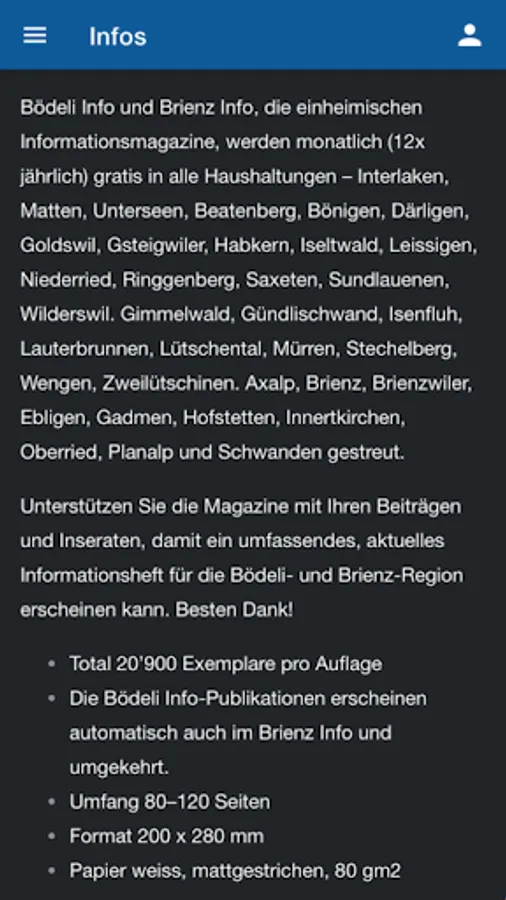 Bödeli Info and Brienz Info, the local information magazines, are distributed free of charge monthly (12 times a year) to all households - Interlaken, Matten, Unterseen, Beatenberg, Bönigen, Därligen, Goldswil, Gsteigwiler, Habkern, Iseltwald, Leissigen, Niederried, Ringgenberg, Saxeten, Sundlauenen , Wilderswil. Gimmelwald, Gündlischwand, Isenfluh, Lauterbrunnen, Lütschental, Mürren, Stechelberg, Wengen, Zweilütschinen. Axalp, Brienz, Brienzwiler, Ebligen, Gadmen, Hofstetten, Innertkirchen, Oberried, Planalp and Schwanden.