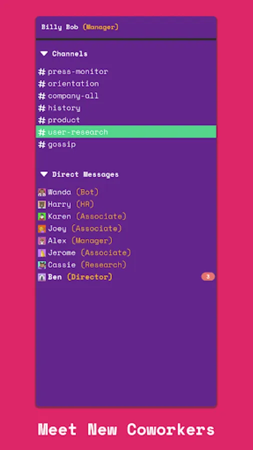 You're a new hire to Redify, a startup that loves changing the world! It's up to you to turn the company around and climb to the executive level by making decisions for the company. Work with a variety of unique co-workers and respond to their messages to navigate corporate politics in this unique twist on a text adventure.