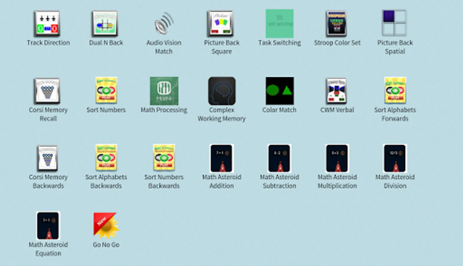 Games included are : Complex Working Memory, Dual N-Back, Stroop task , Flanker task, Corsi block , Tower of London, picture back , revised space fortress , tracking objects, Math games and many more