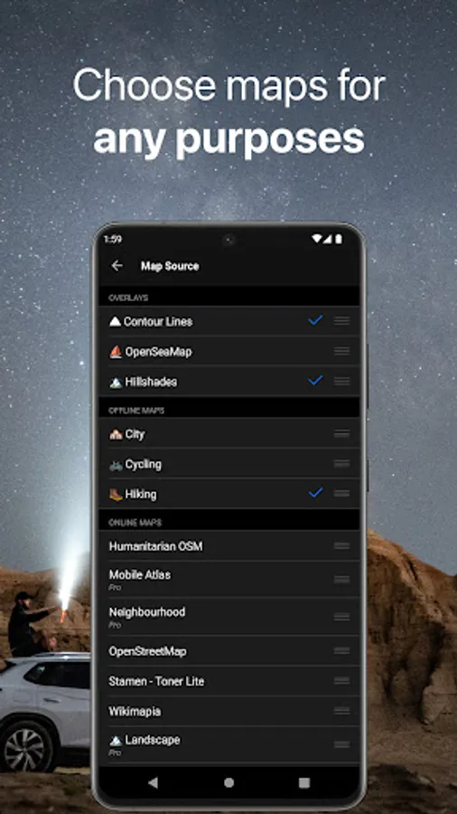 • With a pro subscription, you'll have access to unlimited markers, GPS tracks, and offline map downloads, as well as additional sources and file formats.