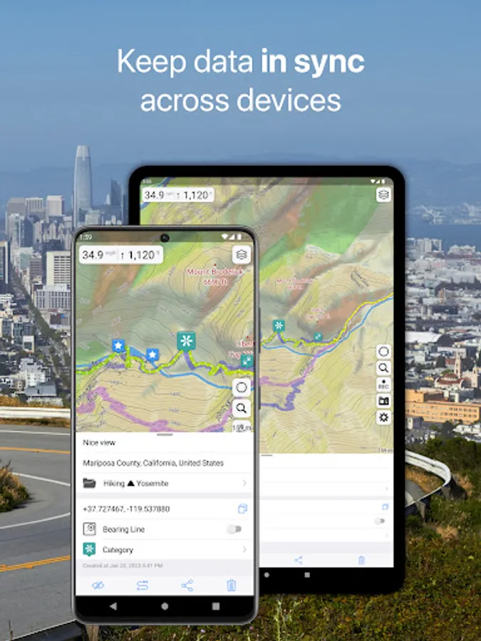 • All the data such as saved places, recorded GPS tracks and created routes will be synced on all your devices on both OS platforms.