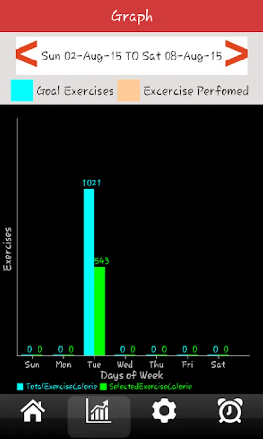 Graphical view shows the weekly graph of Goal Exercise vs Exercise performed daily.