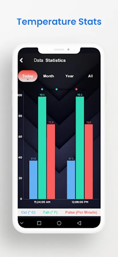 Thermometer for Fever Tracker App stores your temperature values and does not measure your body temperature. The values and graphs are only for identical purpose of body temperature readings.
