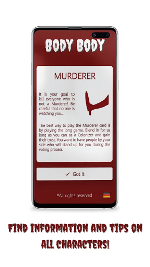 Body Body is an exhilarating and strategic group activity invites you to gather for a thrilling game. As a uniquely gruesome character, you must discover who is murdering fellows in your colony-- perhaps it could be you. Navigate your way through halls and rooms in desperate search of a dead body: a ghastly victim of the murderers. Unravel the identity of the murderers before they kill off the entire colony. Watch your back, your fellows could turn on you.