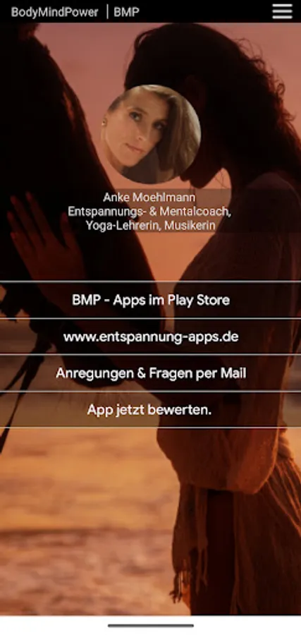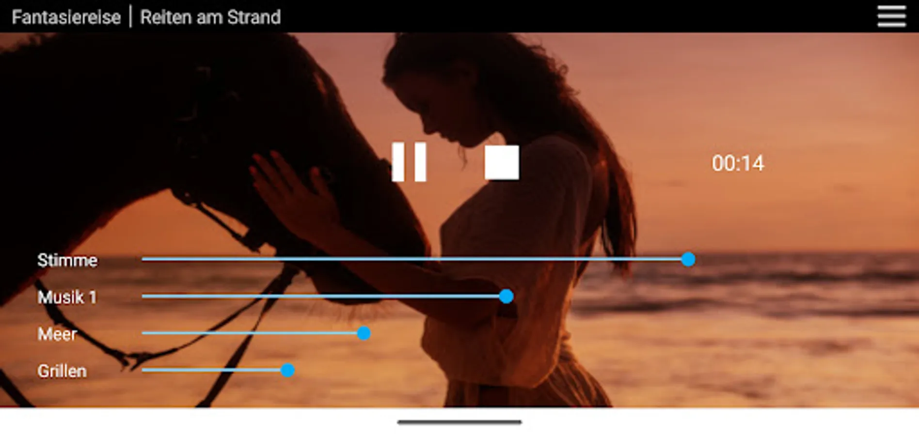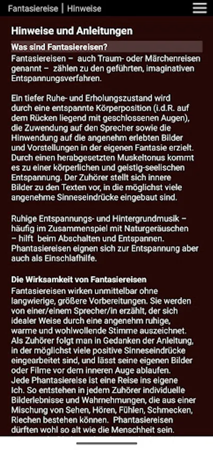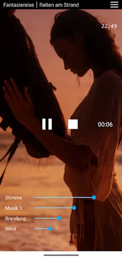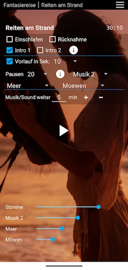 At the beginning of the fantasy journey intros can be selected: long / short intro / no intro. The long intro (9 min) includes breathing exercise and body scan, which will lead you to deep relaxation before the fantasy journey begins. In the short intro (4 min) there is a short introduction with breathing exercise. Without an intro, the fanatical journey begins immediately.