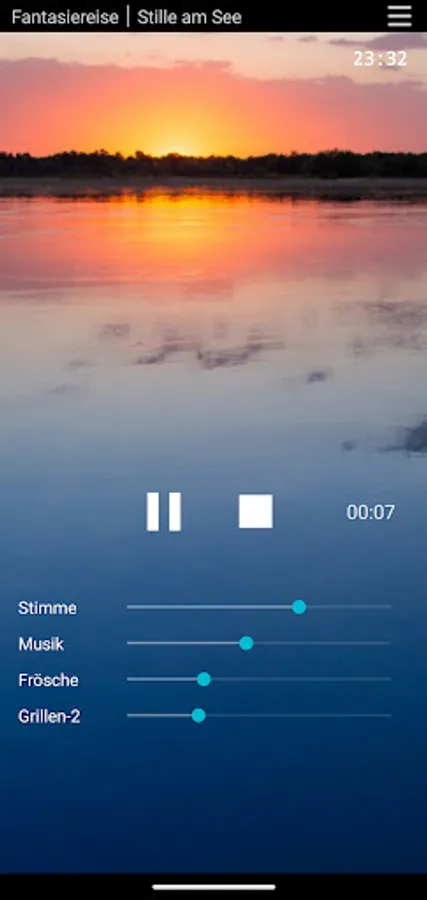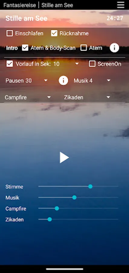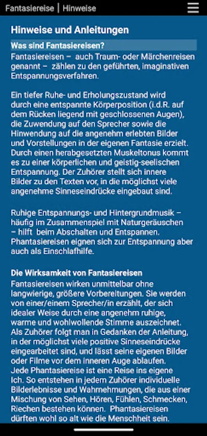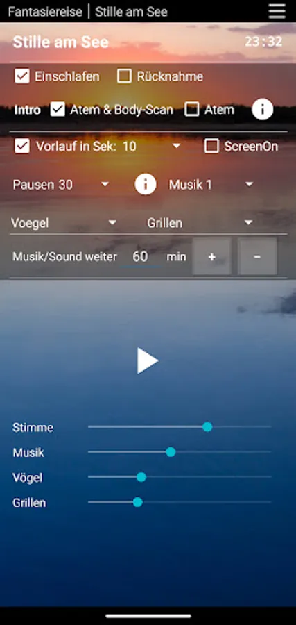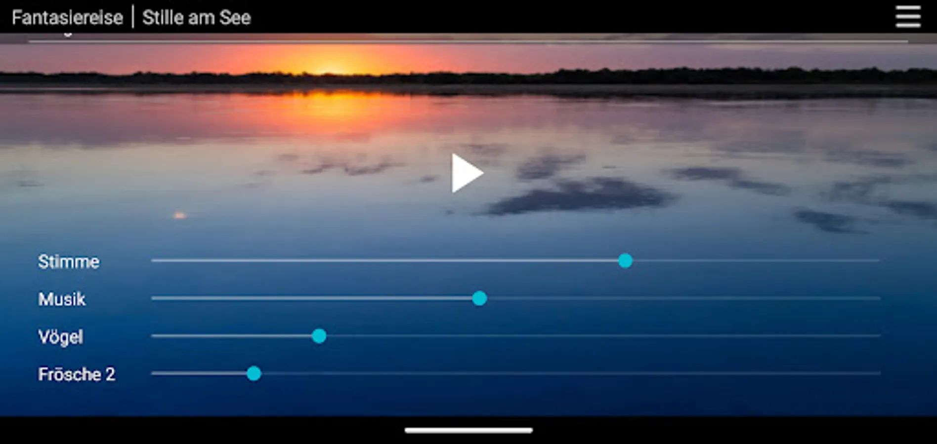 At the beginning of the fantasy journey intros can be selected: long / short intro / no intro. The long intro (9 min) includes breathing exercise and body scan, which will lead you to deep relaxation before the fantasy journey begins. In the short intro (4 min) there is a short introduction with breathing exercise. Without an intro, the fanatical journey begins immediately.
