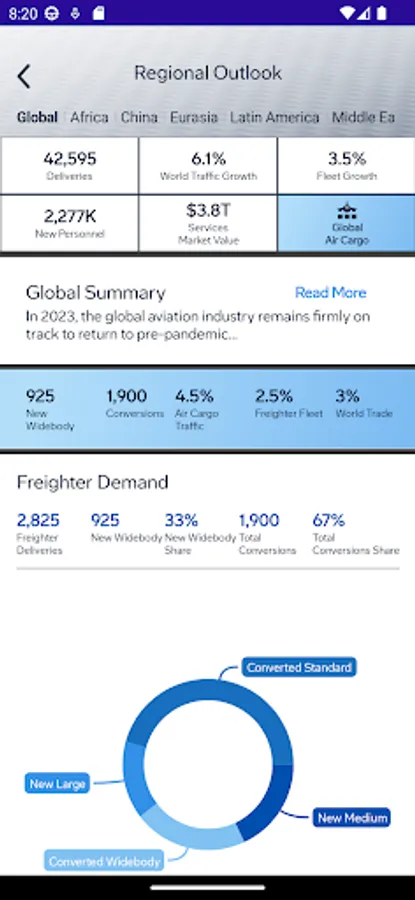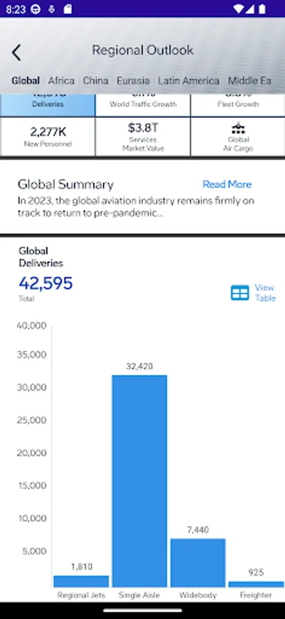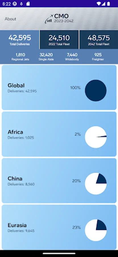 Navigate interactive visuals for deliveries and fleet by market segment including regional jet, single-aisle, widebody and freighter airplanes