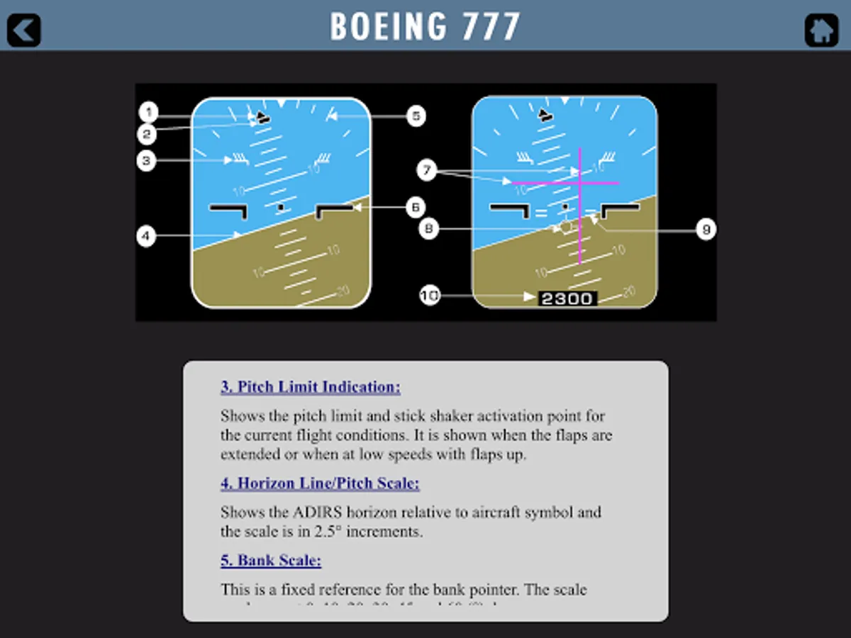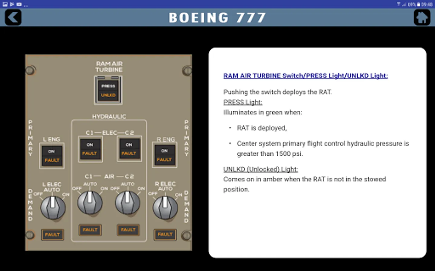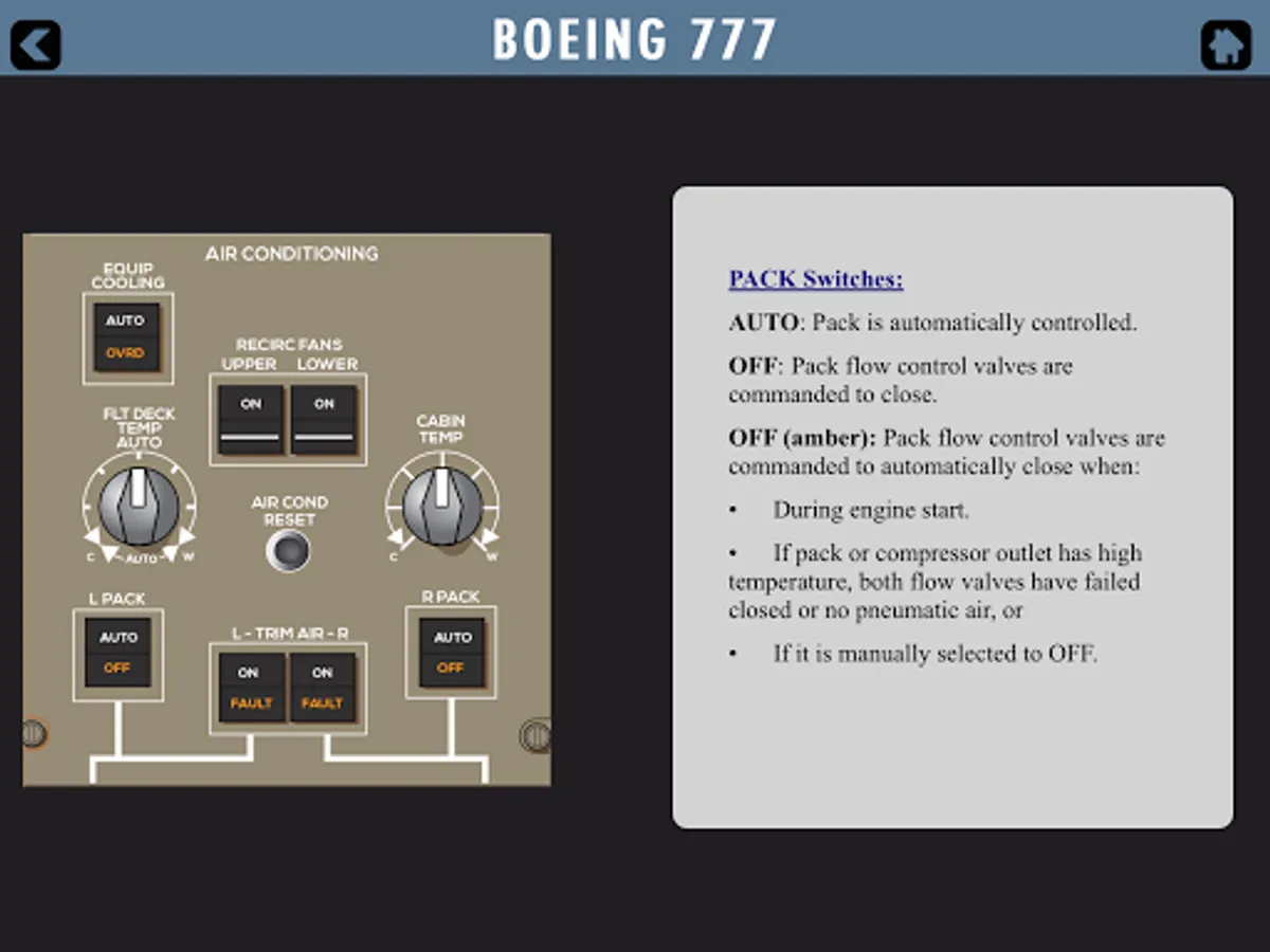 A unique Boeing B777 cockpit trainer and guidance for pilots starting and currently flying this state of the art machine. A simple, easy and ergonomic to use design of application that lets you study the whole flight deck with ease. It covers all the various panels and buttons so information is simply click away for you when you need it. Panels covered include Overhead, MCP, Front displays and switches including PFD, ND, EICAS and MFD with various synoptic pages and the centre pedestal. See our screen shots for more information and the video preview offered. Information is from official FCOM documentation and so proves useful to pilots during flying and training. The app is not for operational use and it is designed for reference and training purposes only. Always reference to your official documentation for line flight operations.