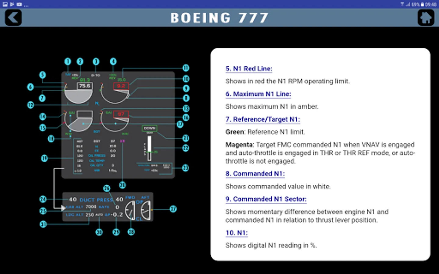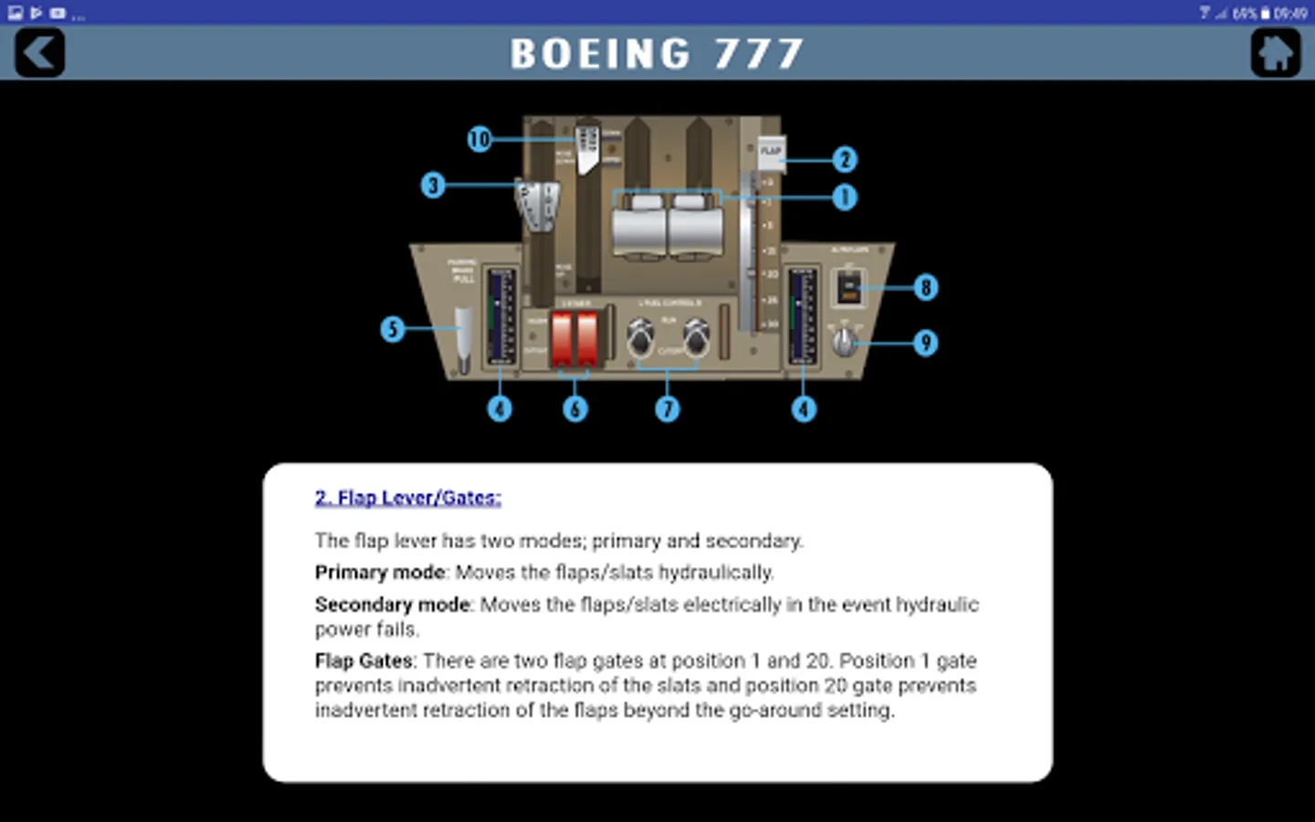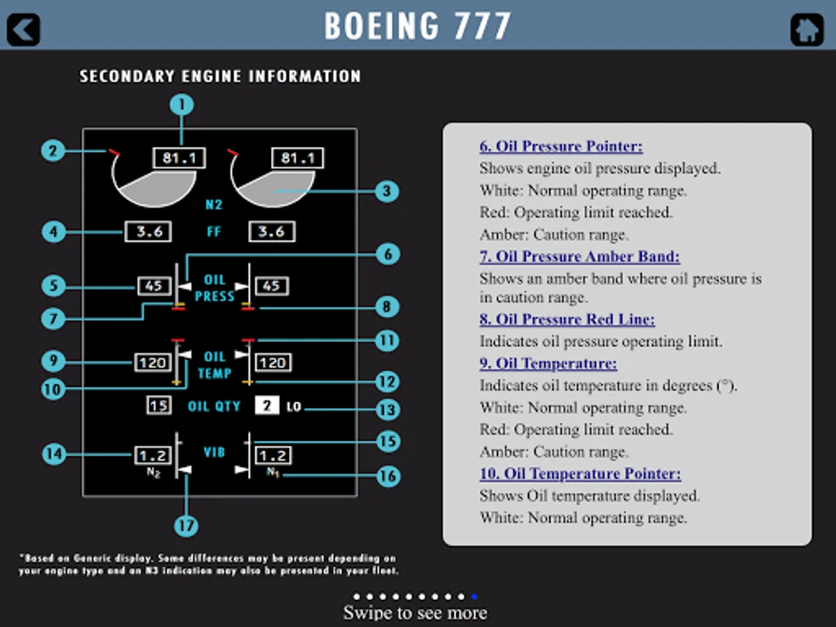 A unique Boeing B777 cockpit trainer and guidance for pilots starting and currently flying this state of the art machine. A simple, easy and ergonomic to use design of application that lets you study the whole flight deck with ease. It covers all the various panels and buttons so information is simply click away for you when you need it. Panels covered include Overhead, MCP, Front displays and switches including PFD, ND, EICAS and MFD with various synoptic pages and the centre pedestal. See our screen shots for more information and the video preview offered. Information is from official FCOM documentation and so proves useful to pilots during flying and training. The app is not for operational use and it is designed for reference and training purposes only. Always reference to your official documentation for line flight operations.