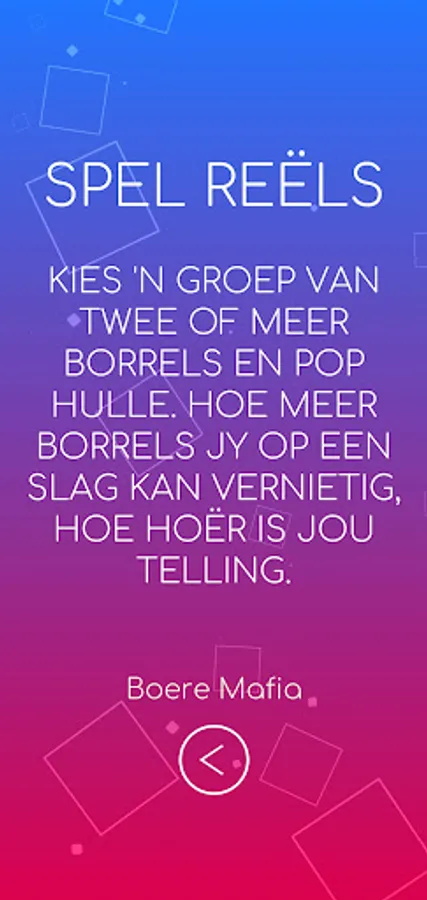 Boere Mafia Borrel Pop is ʼn speletjie waar jy 'n groep van twee of meer borrels kies, dan op hulle klik om te vernietig. Hoe meer borrels jy op een slag kan vernietig, hoe hoër is jou telling. Die speletjie is geskik vir alle ouderdoms groepe en is vir die Afrikaanse mark ontwikkel. Daar is geen inkope of advertensies in die produk nie.