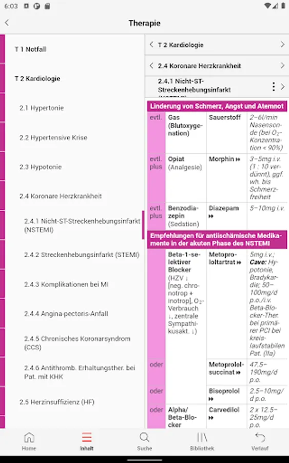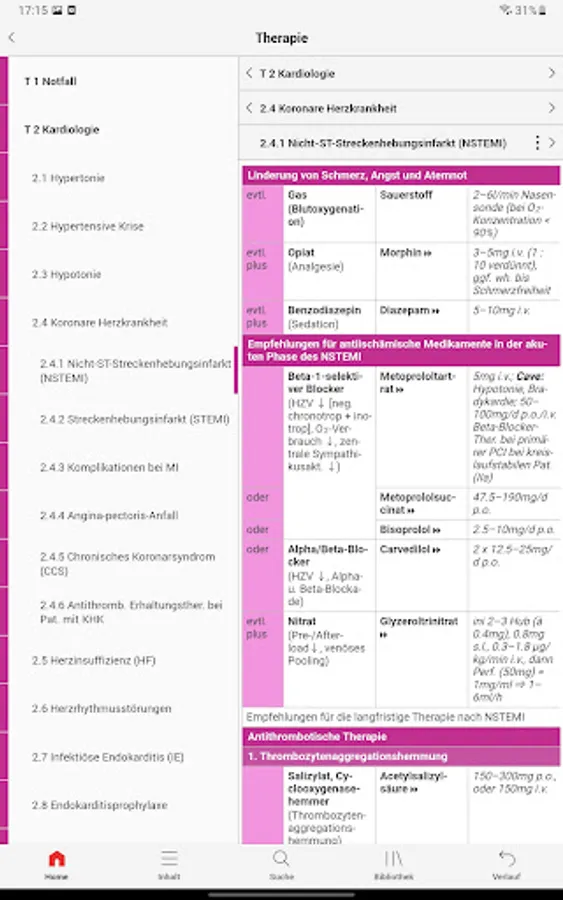 Therapy section: Therapy guidelines for emergency medicine, cardiology, pneumology, gastroenterology, nephrology, endocrinology, hematology/oncology, rheumatology, infectiology, anesthesia, neurology, psychiatry, dermatology, ophthalmology, ENT, urology, gynaecology, paediatrics, toxicology