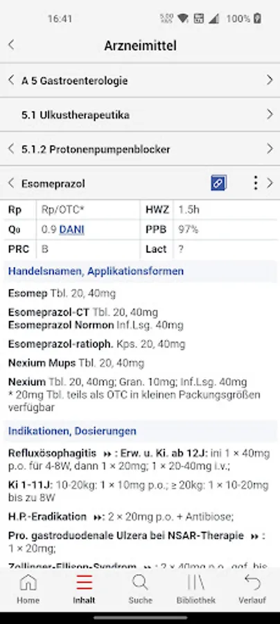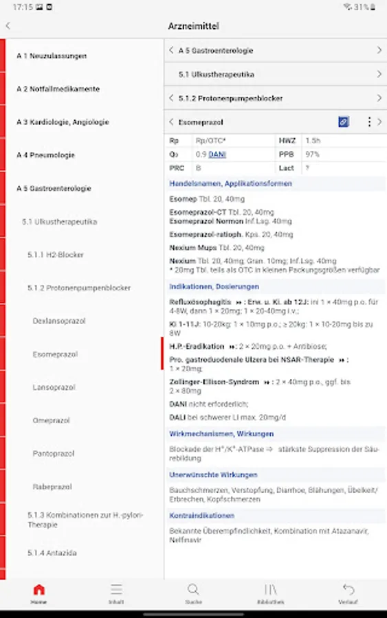 Drug section (over 1800 active ingredients and 4000 trade names) with mechanism of action, effects, side effects and contraindications, prescription requirement, half-life, plasma protein binding, tissue penetration, pregnancy risk category, lactation period, dose adjustment in the case of kidney and liver insufficiency, extrarenal elimination fraction, doping relevance, example information, extra: Geriatric section with a list of potentially inappropriate medications for elderly patients