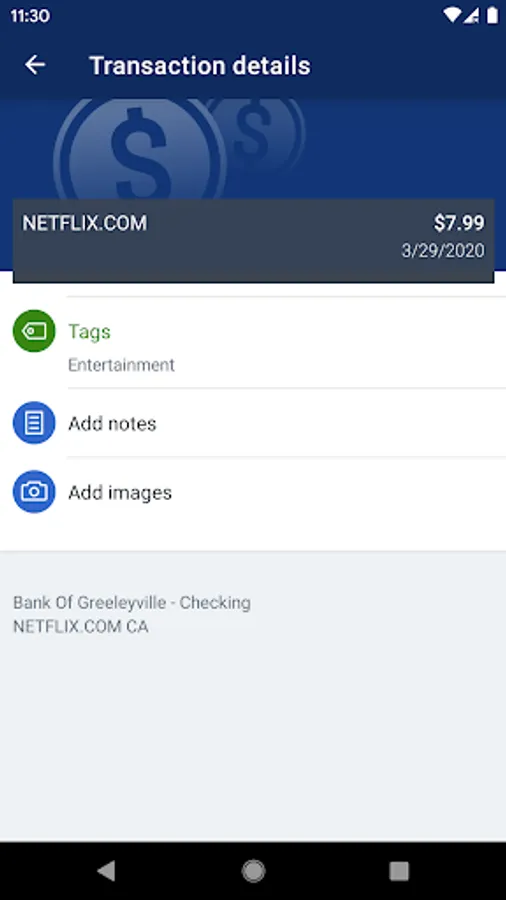 Add Tags, Notes, Images & Geo-Information: By enhancing transactions with custom tags, notes or photos of a receipt or check, you have the ability to stay organized and find exactly what you’re looking for when searching through your finances.