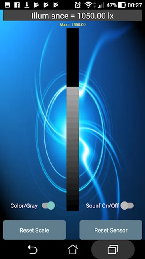 The app allows you to measure the intensity of light radiation by providing a graphical representation. the unit of measurement is the lux, it automatically adjusts the display scale and emits a propoprional sound in frequency with the light intensity