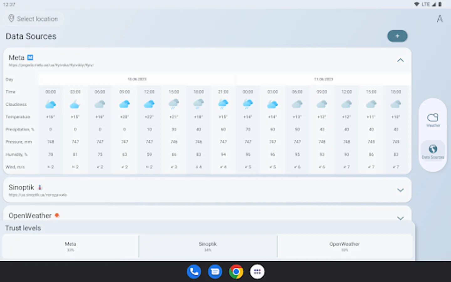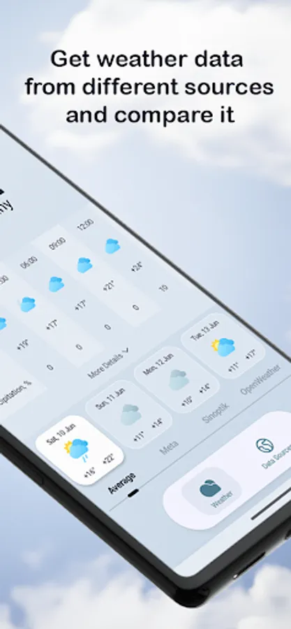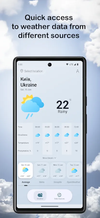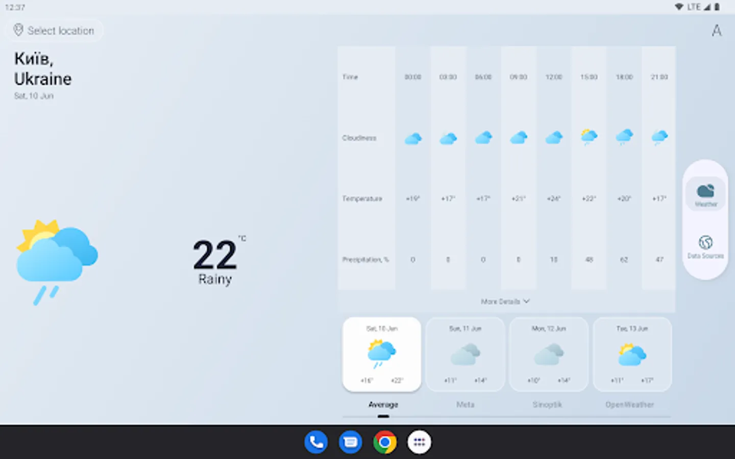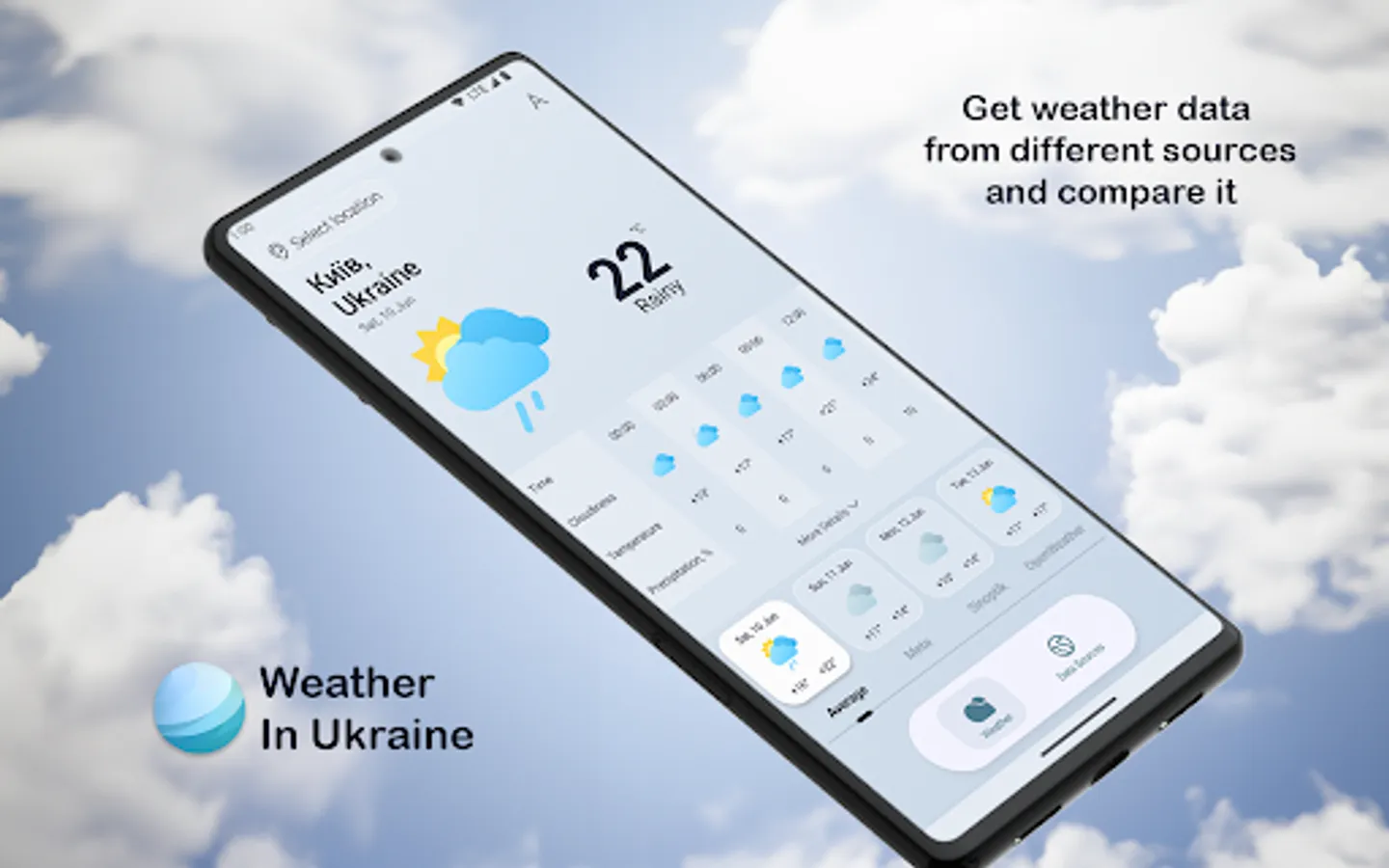 Weather in Ukraine is a convenient and easy-to-use application for displaying weather forecasts from various popular sources such as Sinoptik, META, and OpenWeather. Summarize and compare weather data from these sources and plan your day so that the weather doesn't catch you off guard.