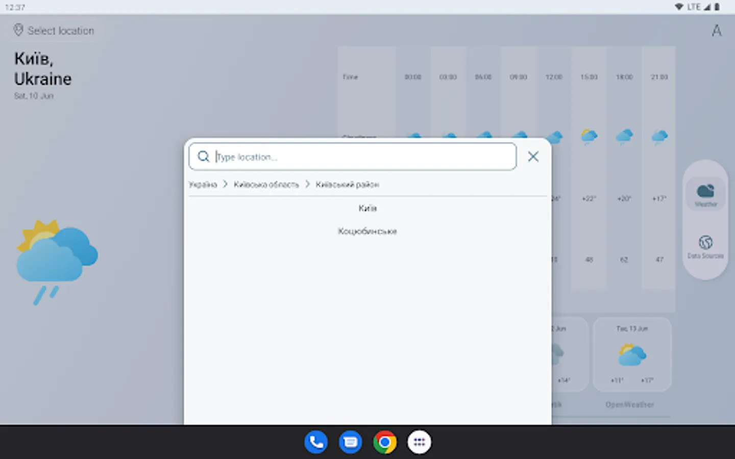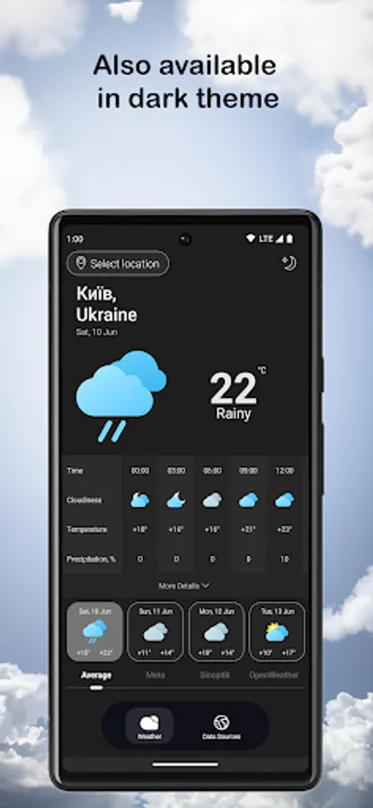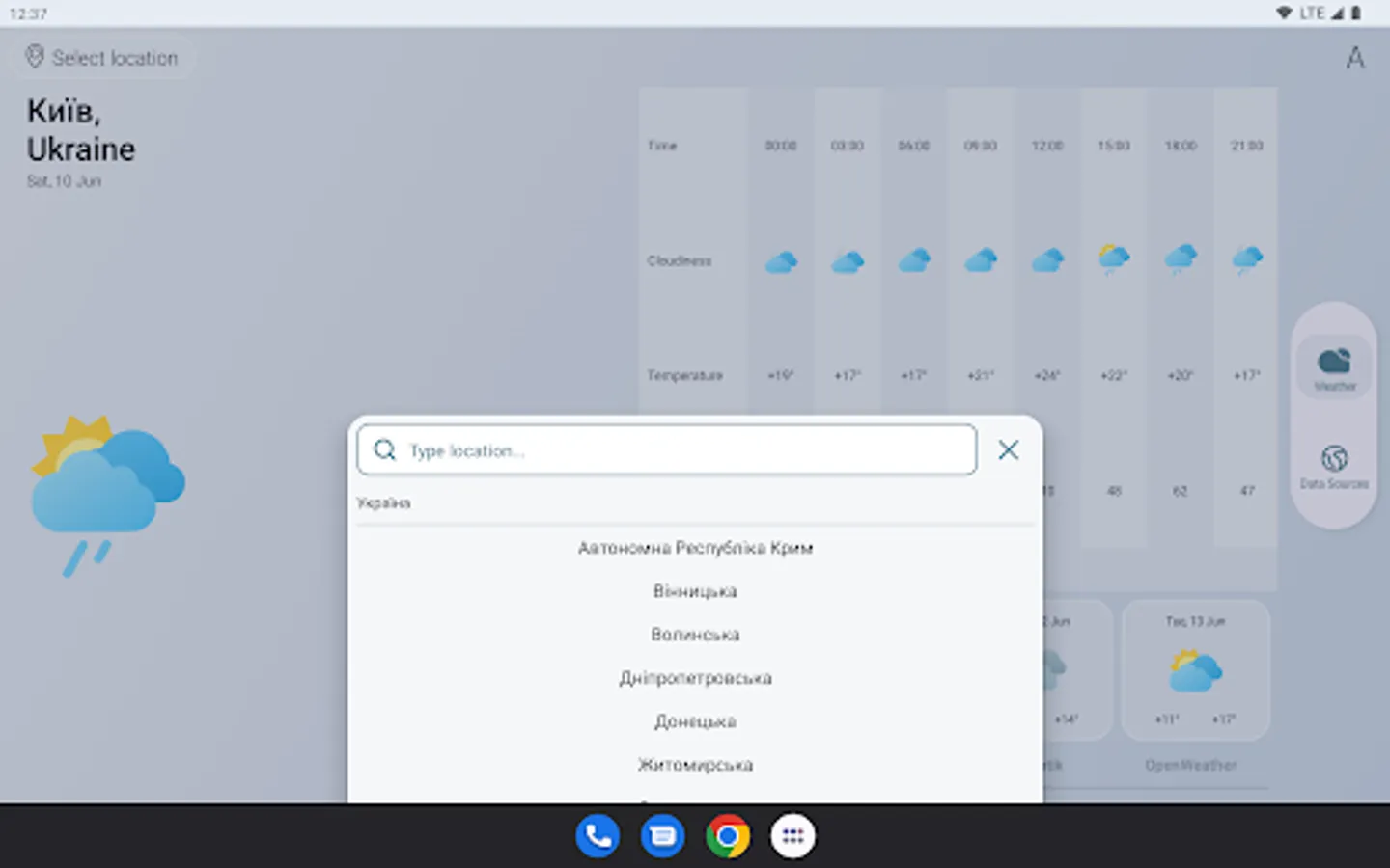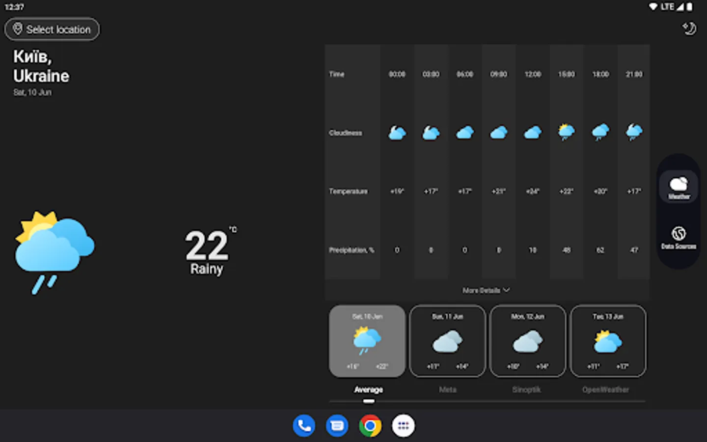 Weather in Ukraine is a convenient and easy-to-use application for displaying weather forecasts from various popular sources such as Sinoptik, META, and OpenWeather. Summarize and compare weather data from these sources and plan your day so that the weather doesn't catch you off guard.