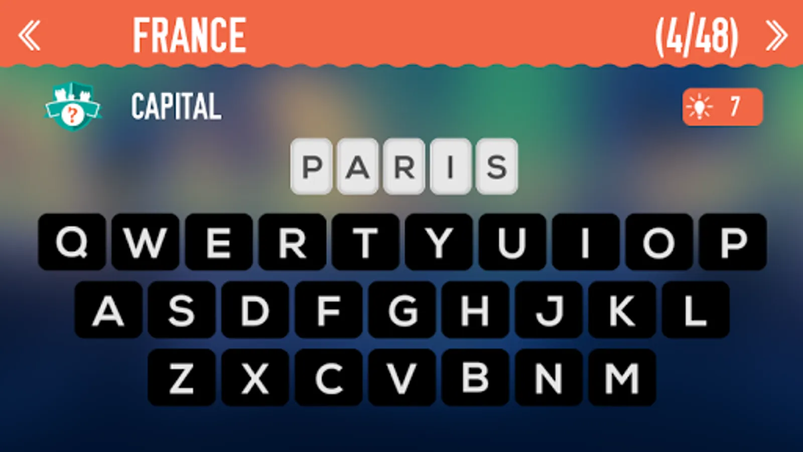 You can answer in any order.To navigate please use the arrows at the top or swipe on the country.