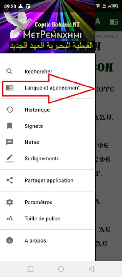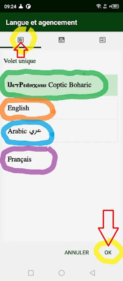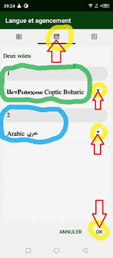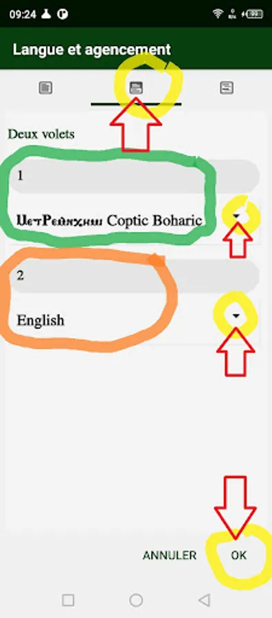 - «deux volets» pour afficher le Coptic en haut et parallèlement la version anglaise ou arabe ou bien française en bas