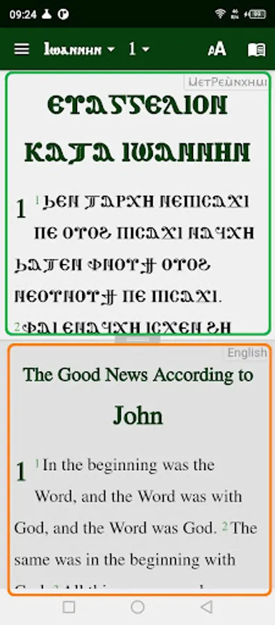 - "two panes" to display the Coptic at the top and the English or Arabic or French version at the bottom