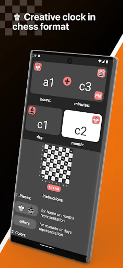 ChessWatch is a digital clock that represents time and date in algebraic chess notation using ordinal number of chessboard cells as a time or date unit. App helps chess players to develop spatial orientation on chessboard and simply to have small brain exercise when exact time needed