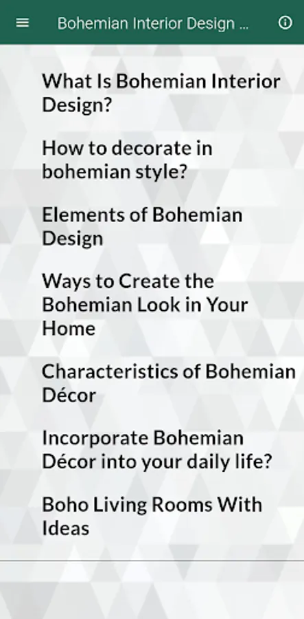 If you have on idea about Bohemian Style Interior Designs, this application can help you. This app. contains the various types of Bohemian Style Interior Design such as colourful, elegant, fantasy, modern, traditional and more.