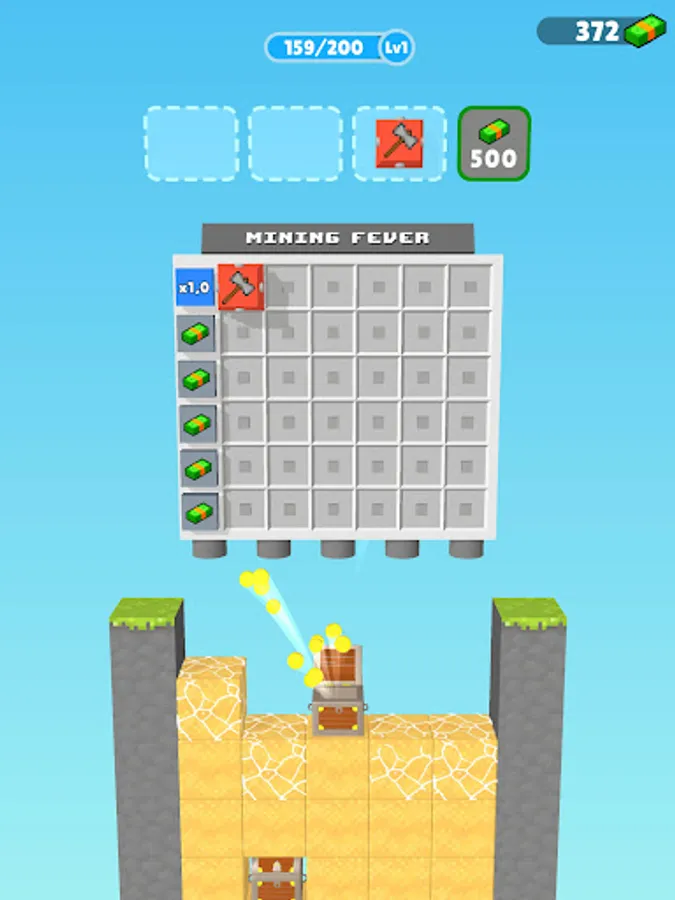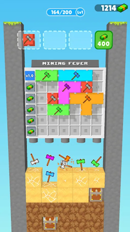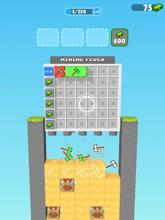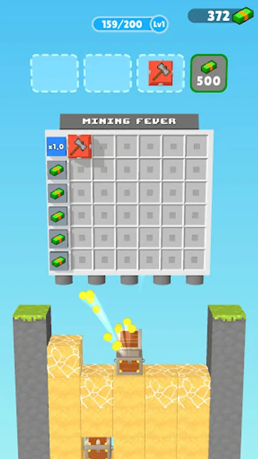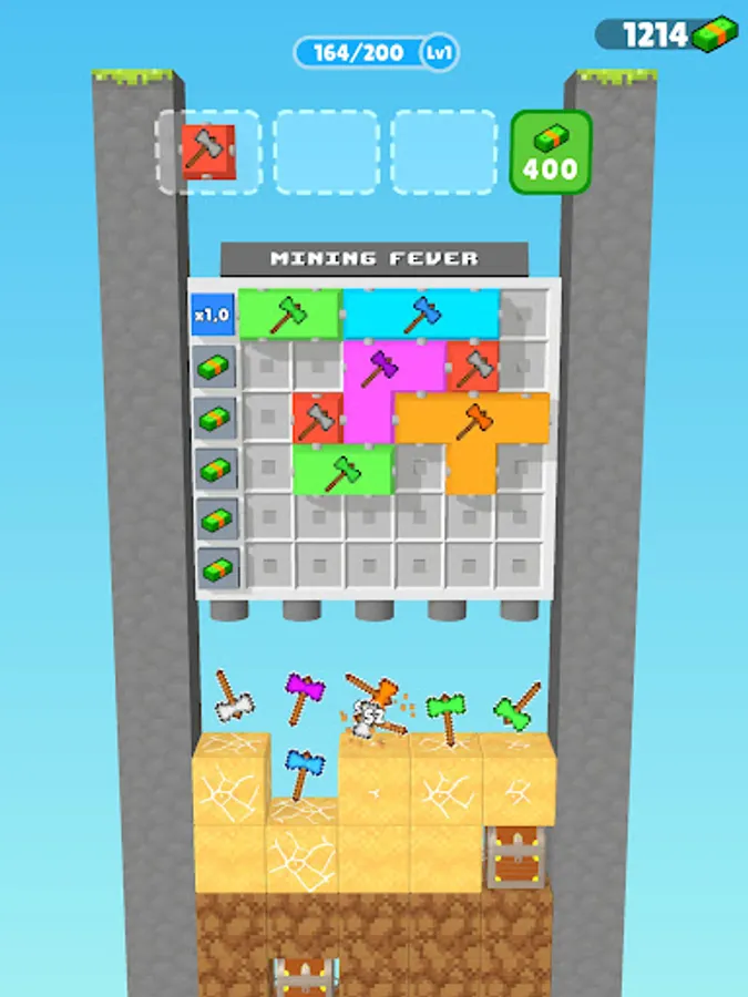 Mining Fever is a fun and addictive game where you can buy buttons and place them on a grid. When you press the button, a pickaxe is generated and falls down, hitting a block below. The more pickaxes you have, the more money you make. Your goal is to mine the blocks and go deeper and deeper, collecting money, buying more buttons and creating more pickaxes.