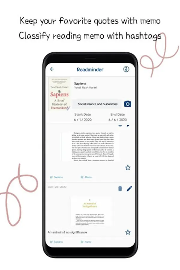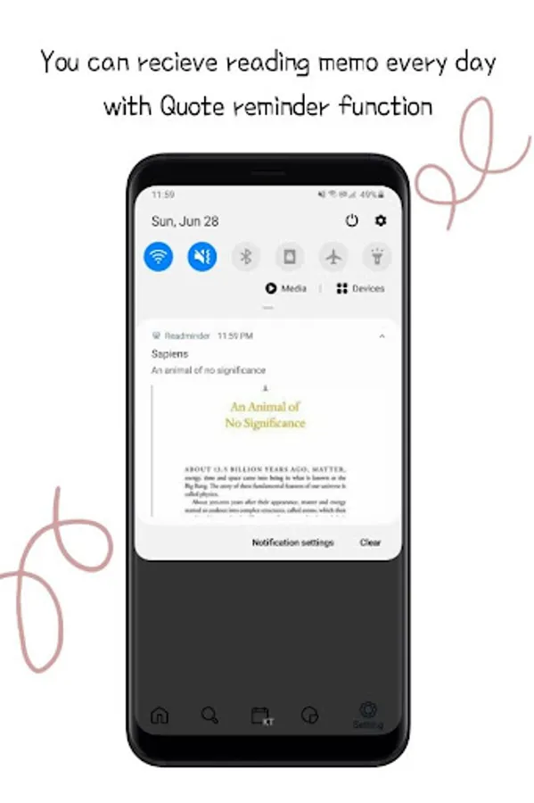 - Set a certain time, then Readminder notifies you the quotes you checked by push alarm notification