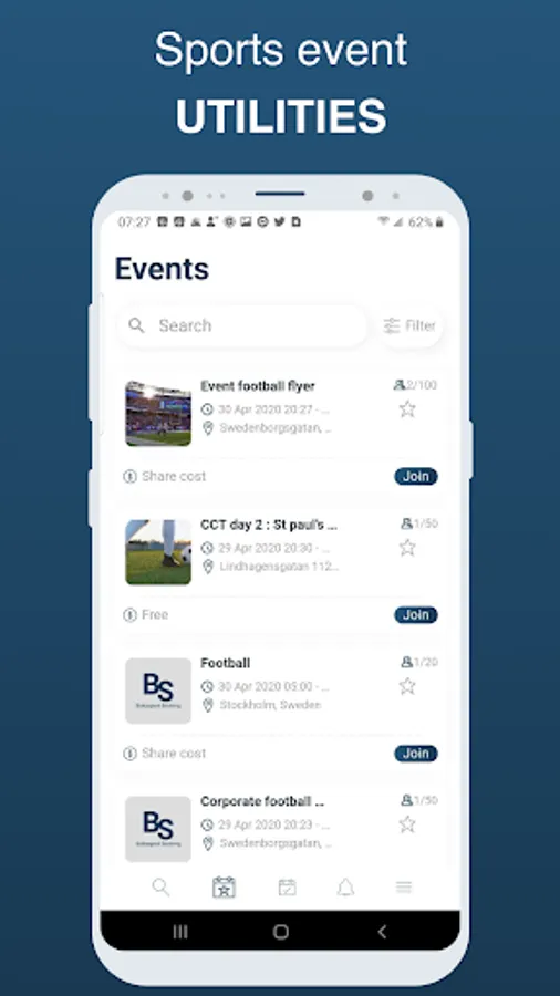 - Create and invite a Sports event to find the play partner.