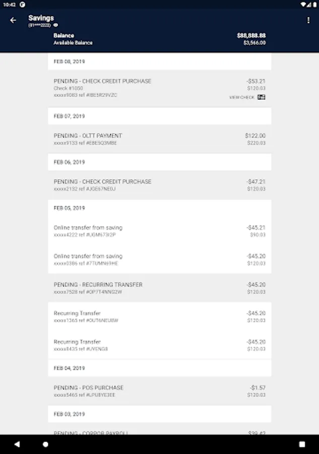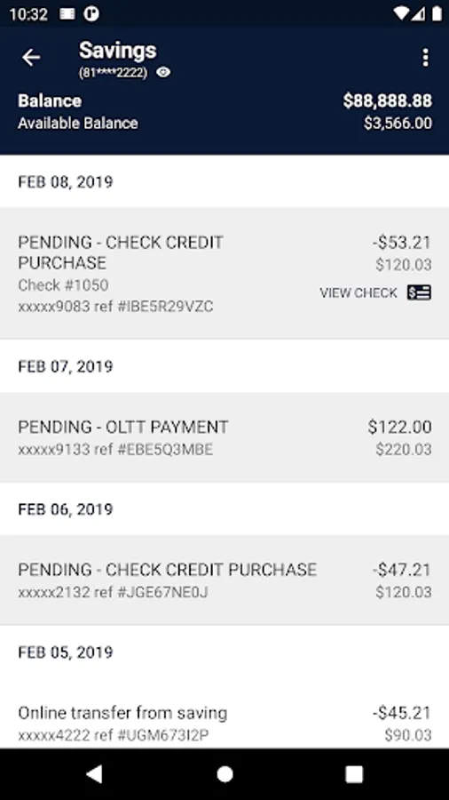 • Account: Check your latest account balances and search recent transactions by date, amount, or check number.