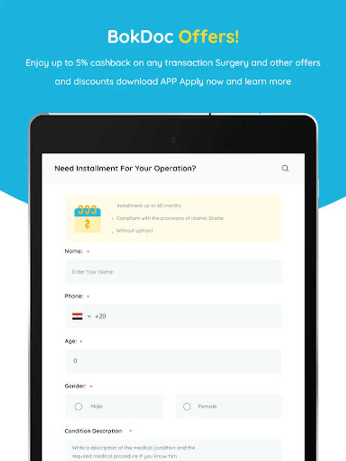 BokDoc is the first in MENA to offer INSTALLMENT SOLUTIONS for its patients for any surgery in BokDoc, 0% interest and without advance payment and up to 5 years.