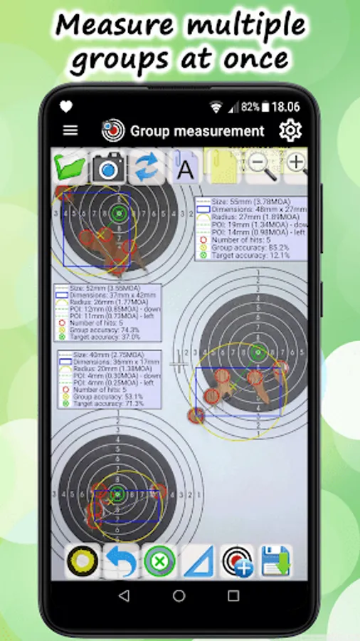 1. PICTURE: Take a picture of a target with shots. You can do this from the main screen or from the group measurement page, with the tools (in menu no.2). You can also take pictures from your public image gallery that you took earlier.